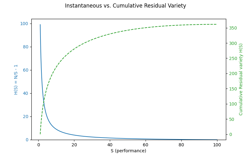 - The residual variety is the uncertainty H(D|R) about the disturbance that remains after observing the regulator's response. This represents the part of the disturbance entropy that the regulator doesn't "know about" or cannot predict i.e. the regulator's "informational blindness" to what it's trying to control. It focuses on the input side - how much the regulator doesn't know about what's hitting the system (the disturbance).